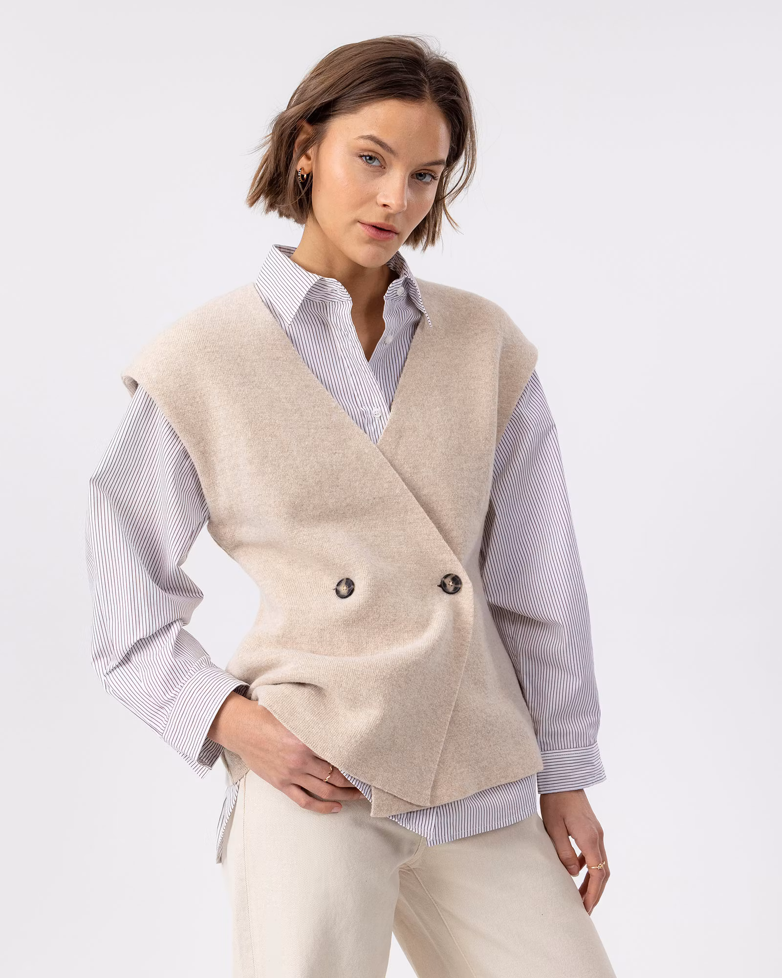 Klassisk milanostickad väst i ull. Dubbelknäppning med två knappar. Nedhasad axel och insvängd midja.